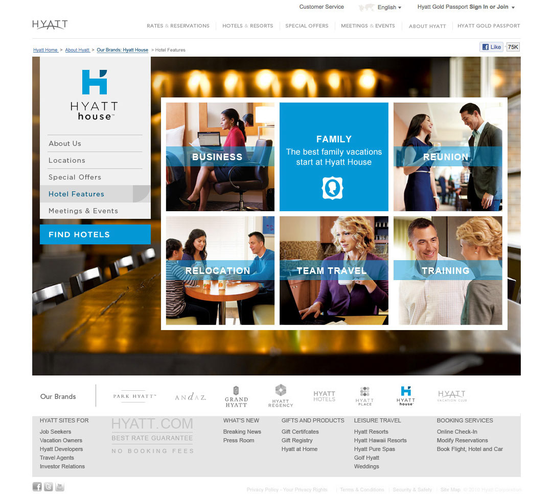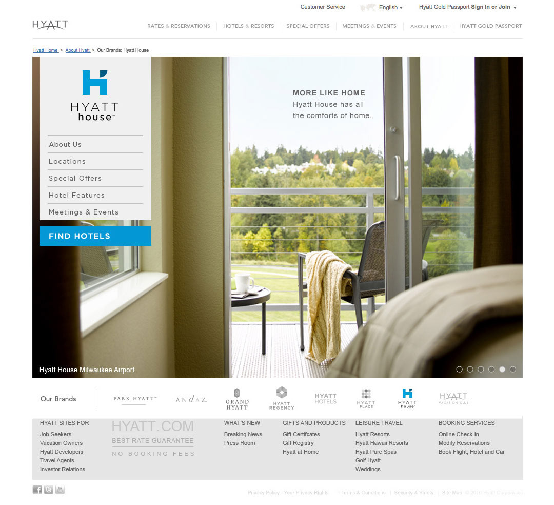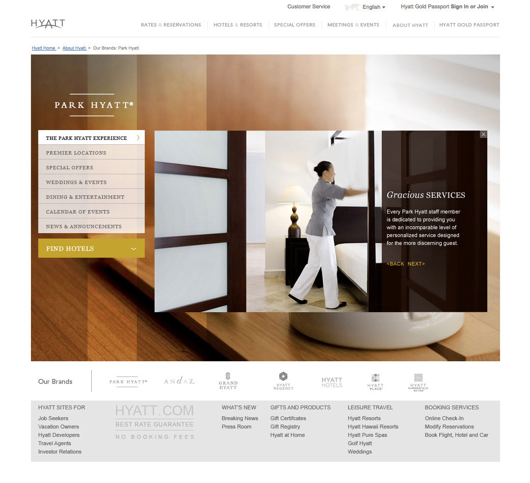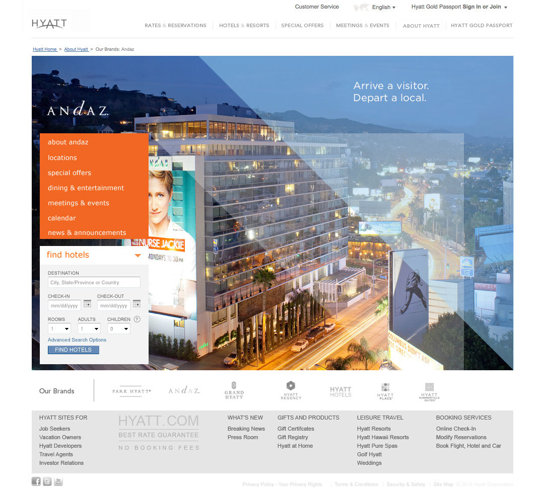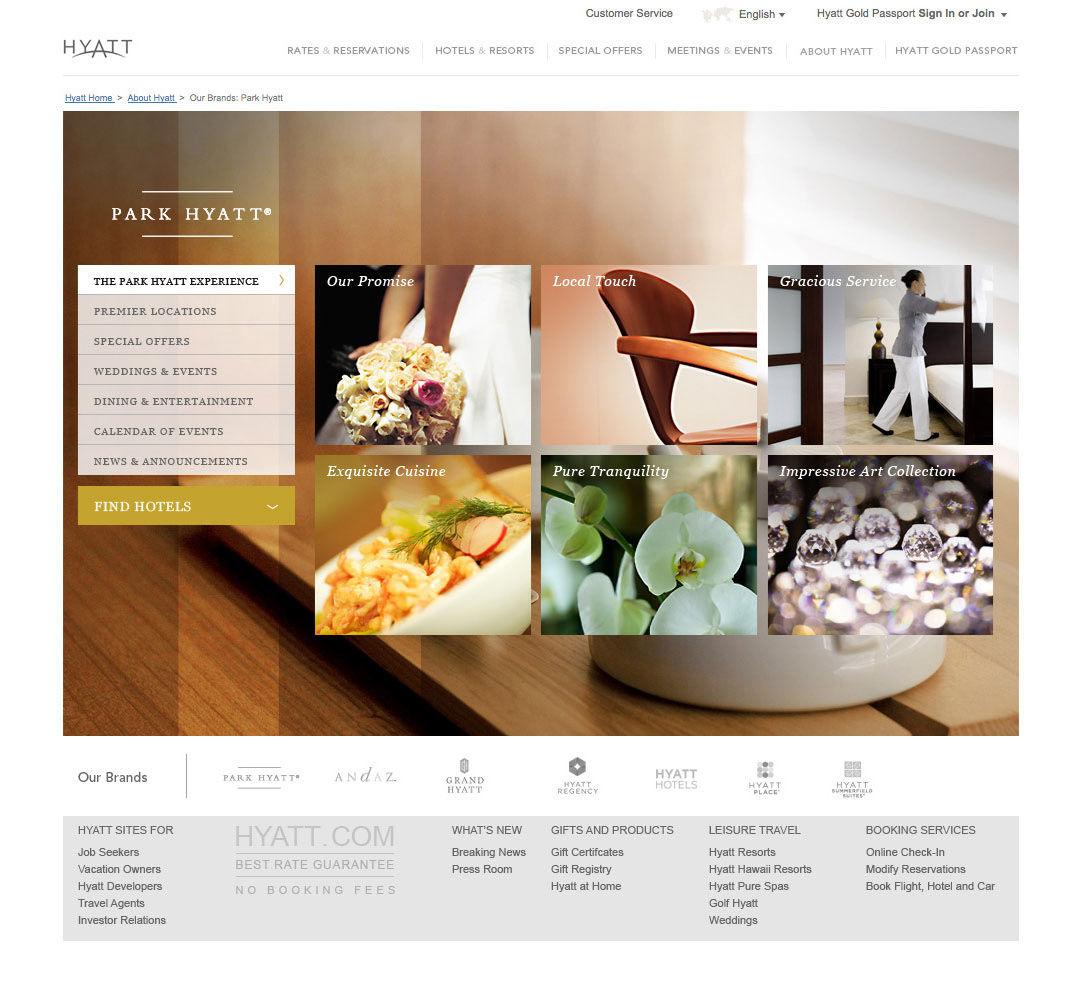 Corporate website and brand microsite redesign for all seven Hyatt hotel brands.